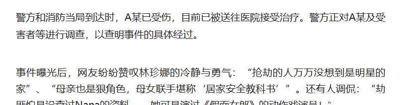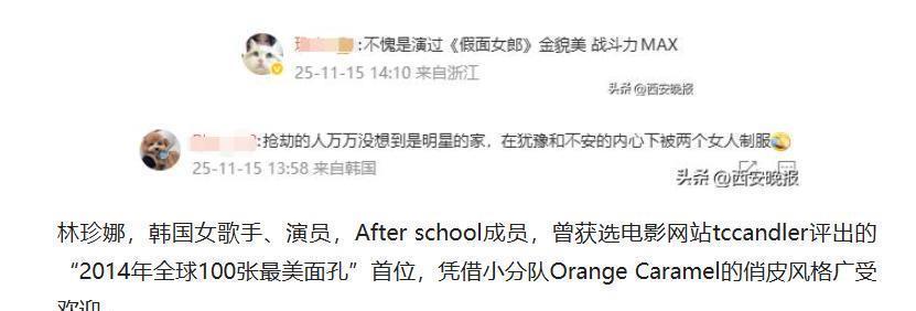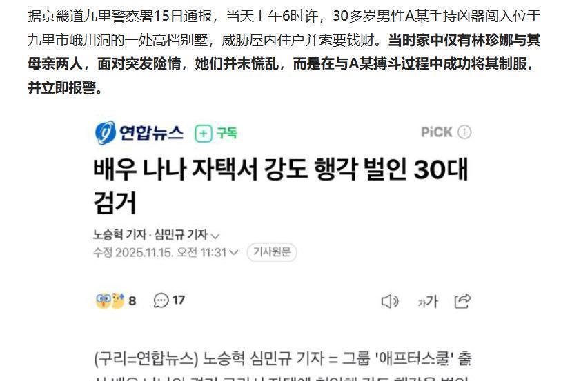 震惊!韩星林珍娜家中遇劫,母女齐心勇斗歹徒事件突发:明星家中遭劫介绍林珍娜的身份背景,引出 11 月 15 日发生在其位于韩国京畿道九里市住宅的抢劫事件,明确时间、地点、人物等关键信息。同时声明:本文依据韩媒报道编写,内容力求真实准确,但不保证与实际情况完全一致,仅供参考,若与事实有出入,以官方发布信息为准。惊险对抗:母女携手制服歹徒详细描述当天上午 6 时许,30 多岁男性 A 某持凶器闯入高档别墅,威胁林珍娜与其母亲并索要钱财,母女二人在搏斗中成功将其制服的过程,展现她们的冷静与勇敢。再次强调,文中对事件细节的描述基于现有报道,不构成任何确定性结论,如有错误或遗漏,不承担法律责任。后续进展:警方介入调查说明警方和消防当局到达时 A 某已受伤被送医,警方正对事件展开调查以查明具体经过。补充免责内容,表明关于事件后续调查结果及相关信息,以警方官方通报为准,本文不做任何预测性保证。网友热议:称赞与调侃齐飞呈现网友对该事件的反应,如赞叹林珍娜冷静勇敢,调侃劫匪没查资料等。最后声明,网友观点收集自公开网络平台,不代表本人立场,因转载这些观点引发的任何纠纷与本人无关。